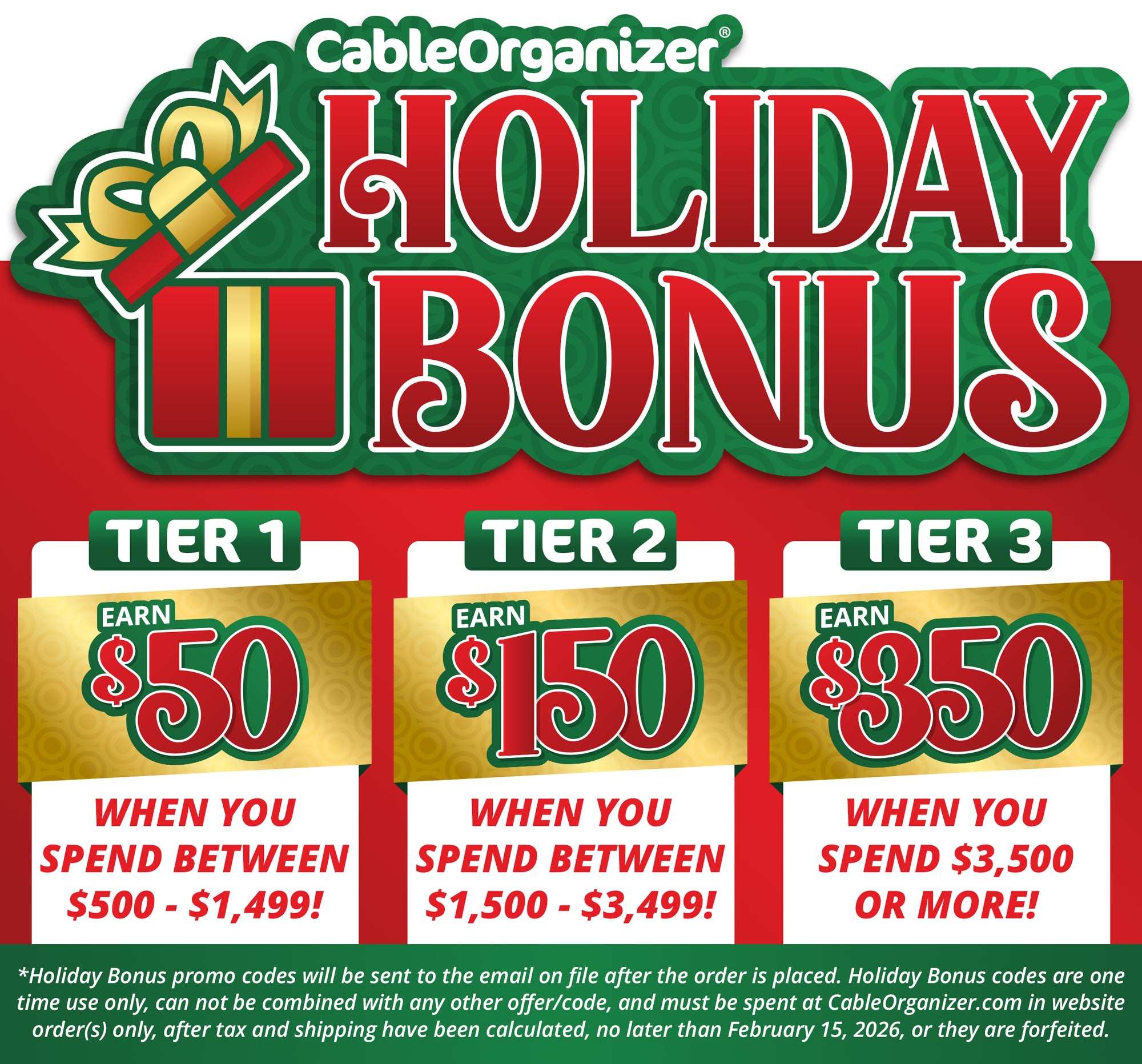 It’s time to give yourself a Holiday Bonus the CableOrganizer® way…now introducing the CableOrganizer® Holiday Bonus program. Just shop with us from December 5, 2025-January 2, 2026, spend between $500 to $3,500+ and earn rewards up to $350. We send you a unique one-time reward code immediately after checkout, that can be applied toward your next CableOrganizer® order, valid through February 15, 2026. Our rewards program is perfect for year-end purchases and starts your first quarter 2026 budget right. Spend more and earn more now with this holiday gift from CableOrganizer®!
